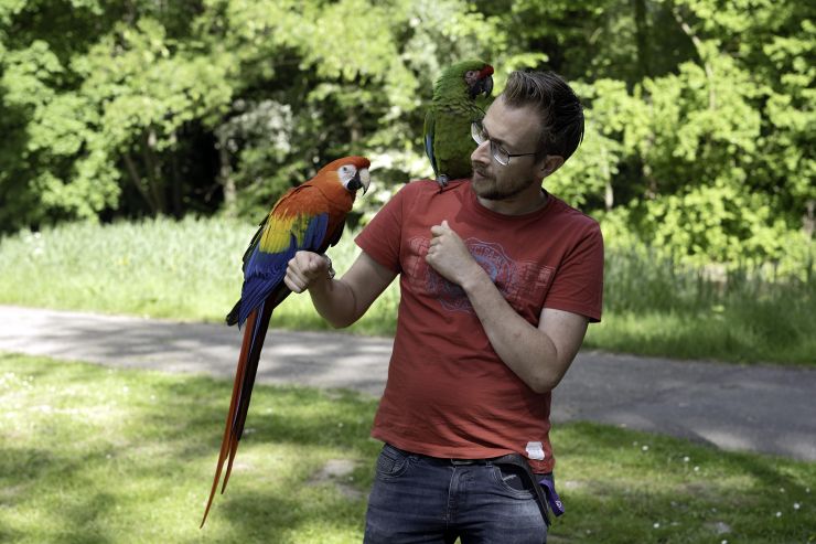 Zoef…! Wat vliegt daar nou voor een bont gezelschap? Als je in Park De Twee Heuvels komt, ben je ze misschien al wel eens tegengekomen: Richard en zijn twee ara’s Dex en Kyra. De felgekleurde vogels zijn een opvallende verschijning, zeker wanneer ze vrij door het park vliegen. Hun baasje Richard Sassenburg (34) geniet er zichtbaar van: ‘Ik laat ze losvliegen als het kan, maar daarvoor moet je wel een hele goede band met ze hebben.’