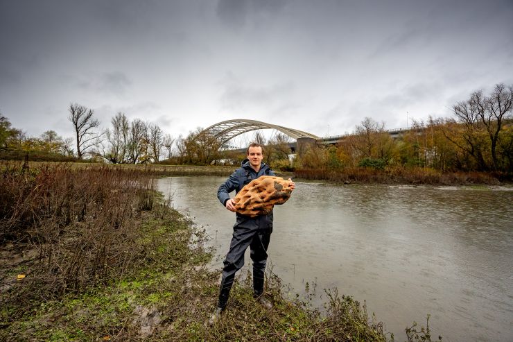 ‘Ook al was het eb, het water stond best hoog’, vertelt Max. ‘Maar ik ben zelf van de natuur, ik hou van ruig weer. Het vismotel weegt ongeveer twintig kilo en door de modder op de bodem moest ik even mijn weg vinden, maar het is gelukt.’ Het nieuwe motel heeft een andere kleur dan het eerste. ‘Het is gemaakt van bagger uit de Maas en is nu nog lichtbruin. Waar de bagger vandaan komt, bepaalt de kleur. Het andere vismotel ligt er nu zo’n zes weken en is door de algen al een stuk donkerder geworden.’