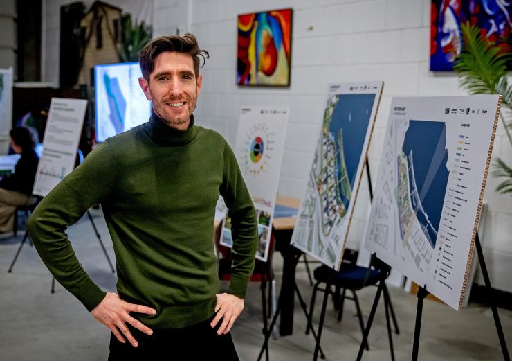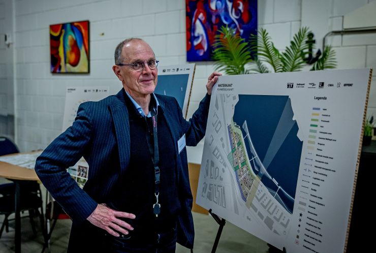 Christophe Cornille, landschapsarchitect gemeente Rotterdam over de plannen: ‘Dit plan voor Waterkant mag je wel uniek noemen voor Nederland, én het is bovendien super complex. Er komen heel veel woningen én we hebben te maken met hoogteverschillen vanaf het Varkenoordseviaduct naar de Maas. Dat lossen we op door de ruimte – het maaiveld - zeg maar op te tillen, we maken er vanaf het viaduct een geleidelijk aflopend landschap van. Parkeren voor bewoners gaat onder een dek, onder dat opgetilde maaiveld gebeuren, over een lengte van zo’n 500 meter. Aan het Varkenoordseviaduct komt het entreeplein: een groene overkapping over het spoor. De Urban Sports & Street Culture Campus komt aan het Mallegatpark en ook in de buitenruimte maken we veel plek voor urban sports. Verder komt het getijdenpark Feijenoord en en een drijvend zwembad op de Maas. En natuurlijk voorzieningen die nodig zijn in een wijk zoals een basisschool, kinderdagverblijf, winkels, horeca en een gezondheidscentrum. Dat staat allemaal in het stedenbouwkundig plan. In het omgevingsplan staan alle regels waar de plannen aan moeten voldoen.’