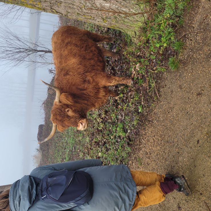 Het Eiland van Brienenoord heeft sinds de grote opknapbeurt 1,7 kilometer natuurvriendelijke oevers met ruimte voor de getijdennatuur. Matthijs: ‘De oevers zijn aflopend, flauw, gemaakt. Veel vissoorten hebben dat nodig om te schuilen en te paaien. Het slik, de modderige grond die je goed ziet tijdens eb, zit vol leven en wordt steeds groener. Er groeien algen en grassen op en de scholeksters zoeken er naar korfmossels om te eten. En je kan er zelf lekker struinen.’ Dan pakt Matthijs zijn gitaar en klinkt zijn lied over het water terwijl de deelnemers zachtjes meezingen. Heel even kijken de vier Schotse Hooglanders nieuwsgierig op, grazen dan weer rustig verder.