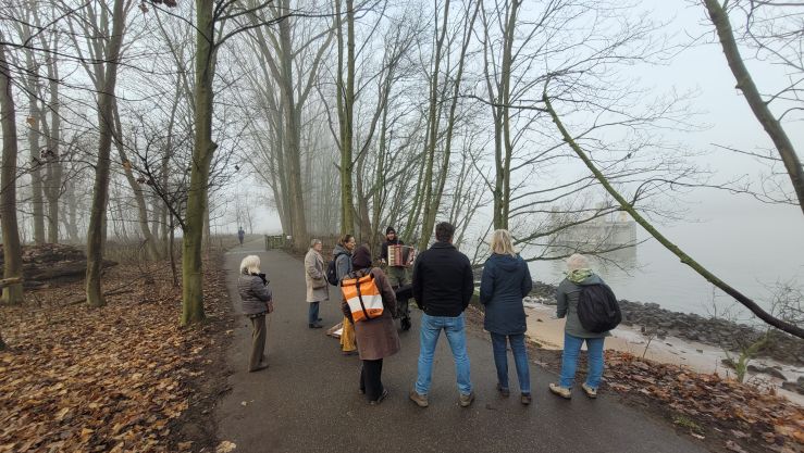 Een mistige winterochtend in Stadionpark… een groepje Rotterdamse natuurliefhebbers staat klaar voor de eerste getijdenwandeling over het Eiland van Brienenoord. Een evenement georganiseerd door Stadionpark, onder muzikale begeleiding van Matthijs Lievaart. ‘Veel mensen weten niet dat de zee twee keer per etmaal via de Maas helemaal Rotterdam instroomt.’