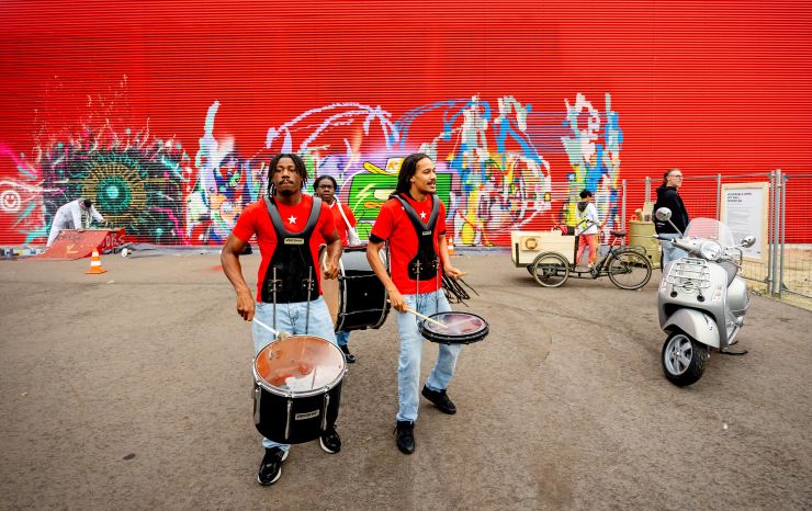 Picture this: een immens lange, hoge, nu nog rode muur waar je op kan spuiten, verven, stencilen of sprayen… kortom helemaal je eigen ding kan doen. Of je nou street artist, student, kind, jongere, bewoner of boomer bent. Met sissende spuitbussen en brass beats is deze woensdag de Art Wall in Stadionpark geopend. ‘We zijn de eerste legale en grootste oefenplek in Nederland waar iedereen welkom is. En daar zijn we superblij mee!’, vertelt Katherina Doxiadis, directeur van ALL CAPS.