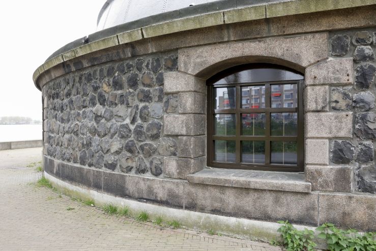 ‘In de ramen van de grote koepel zat bruin plexiglas. Die zijn vervangen door dubbel, transparant glas en de kozijnen zijn geschilderd. Nu komt er daglicht binnen en heb je mooi zicht op de Maas. De kozijnen met de ramen in de kleine koepel zijn bijna allemaal dichtgemetseld. De oude kozijnen worden binnenkort verwijderd en krijgen nieuwe in dezelfde stijl als de grote koepel.’